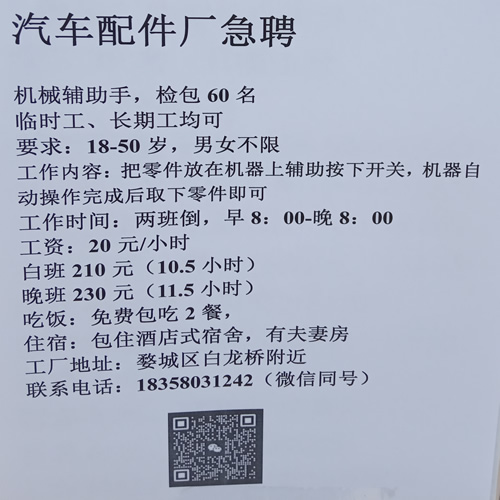 汽车配件厂急聘临时工