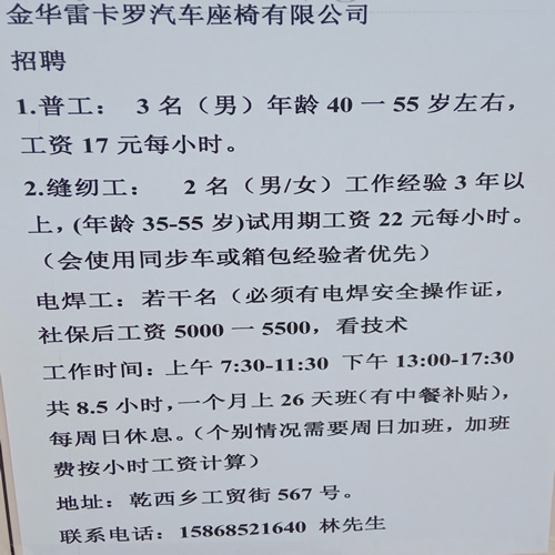 雷卡罗汽车座椅有限公司招缝纫工