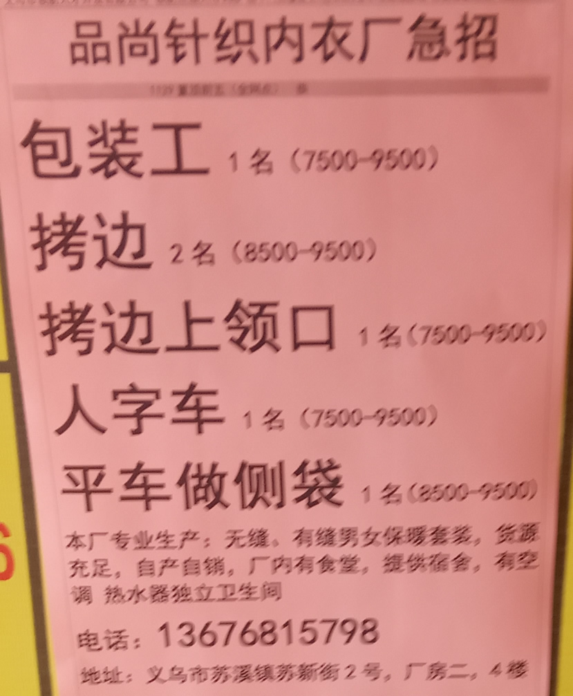 棉袜包装工4名,工资5500–8000,包吃住